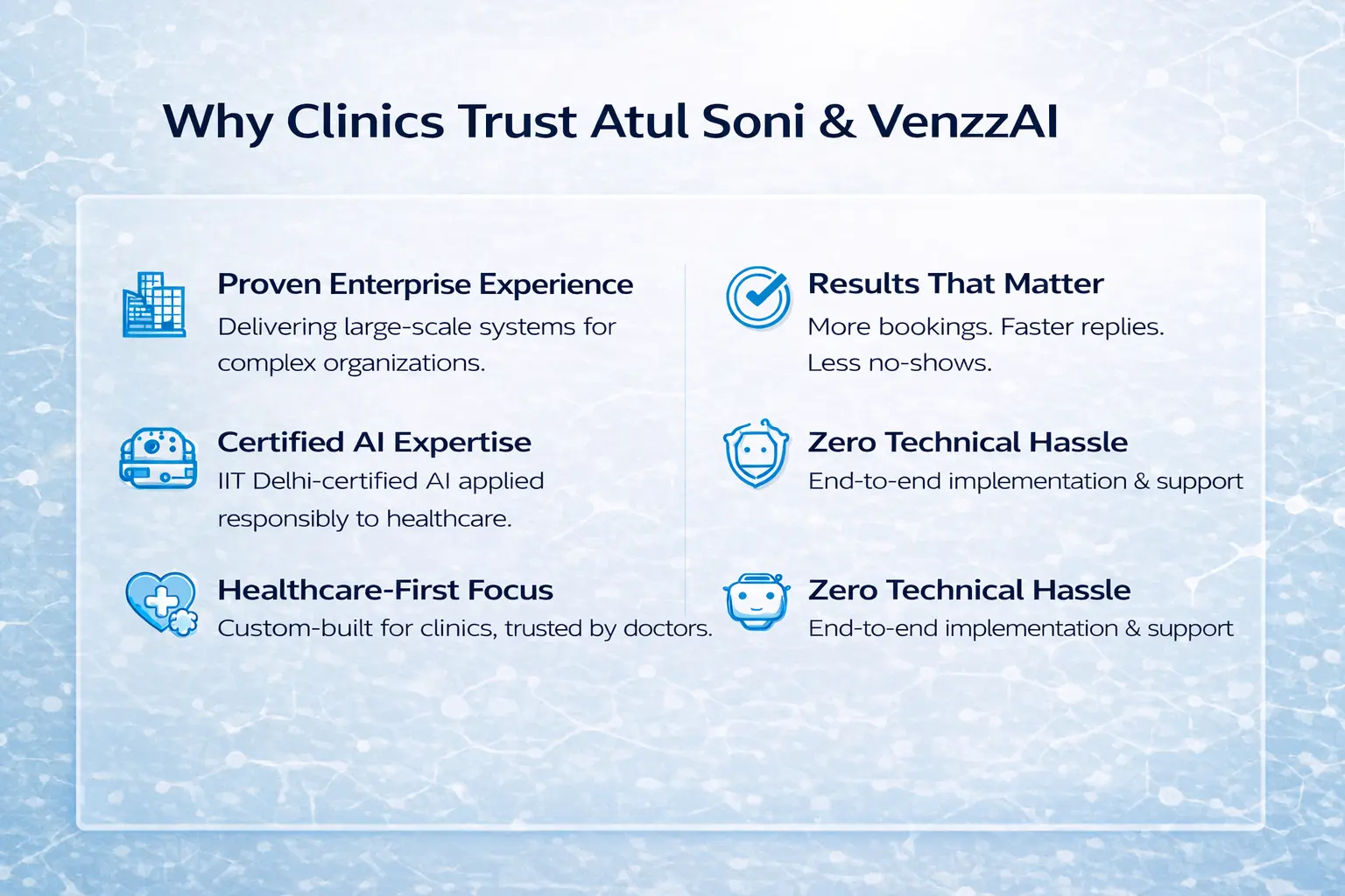 I’m Atul Soni, founder of VenzzAI an AI-powered automation agency built exclusively for doctors and healthcare clinics.